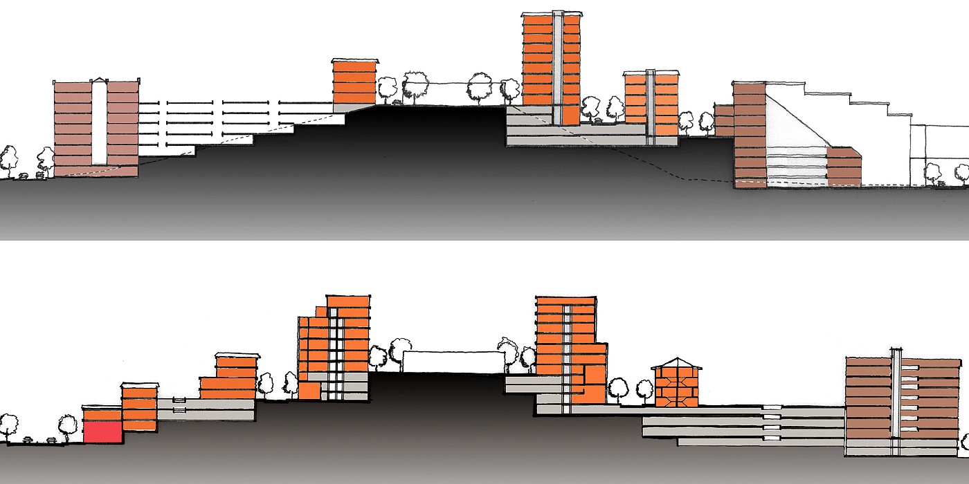 Located adjacent to a major shopping mall in Raleigh, North Carolina, Kidds Hill is a mixed-use development situated on steep hill, master planned by Shook Kelley.